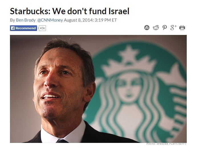 After learning that a boycott of Starbucks had begun based on the belief that Starbucks "supports" Israel, Starbucks CEO Howard Schultz went public to refute claims that they "support Israel". If he's so concerned that anti-Israel boycotters will hurt his business, let's show him what pro-Israel folks can do! In case you haven't noticed, there isn't a single Starbucks in Israel. There are Coffee Bean stores all over Israel.
