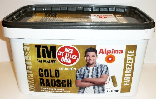 Alpina, Tim Mälzer Goldrausch Goldgrün Komplettset. Effekt-Farbe für samtig schimmerndes Wand-Design. Dieses Komplett-Set enthält: 3 L Goldrausch Basis, 1 L Goldrausch Finish, 1 Alpina Effekt-Kelle, 1 Anleitungs-DVD.